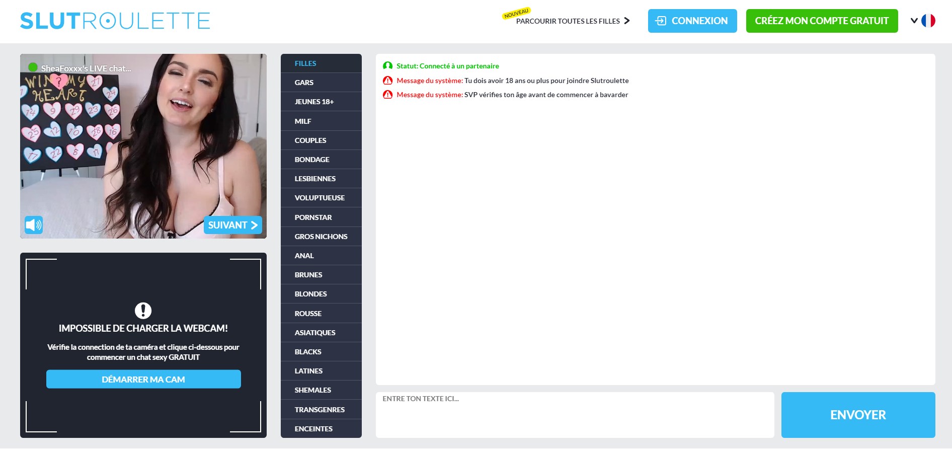 SlutRoulette сначала представляет вам домашнюю страницу, которая выглядит как развратная версия ChatRoulette (отсюда и название), но на самом деле это всего лишь предварительный просмотр. За ним действительно скрывается веб-камерный сайт с большим выбором моделей (в основном женского пола, хотя представлены все полы/ориентации).